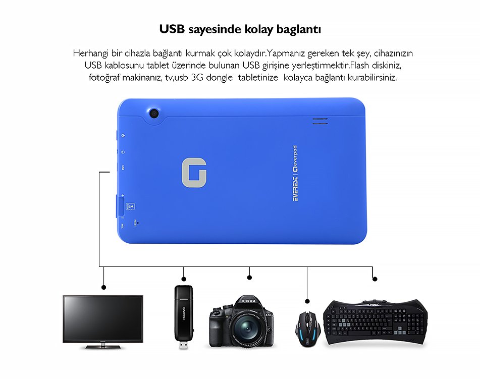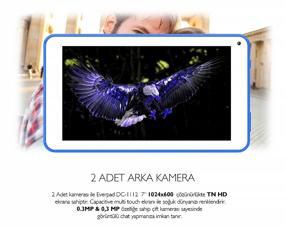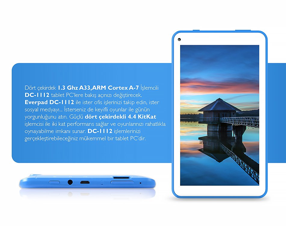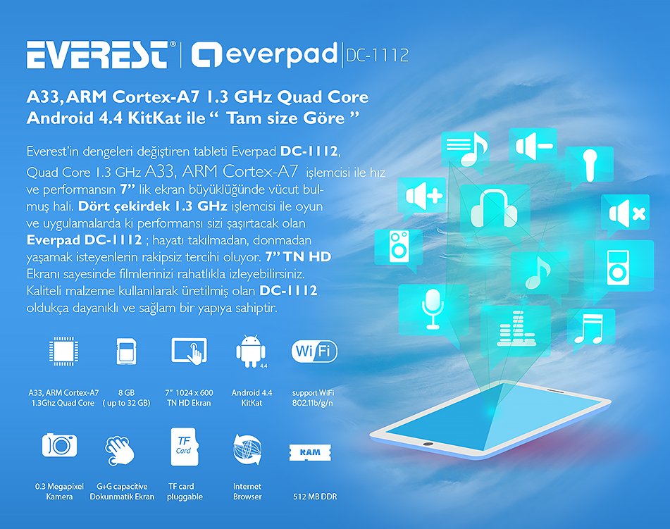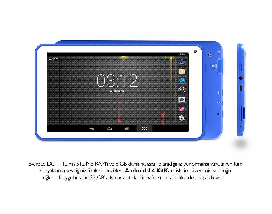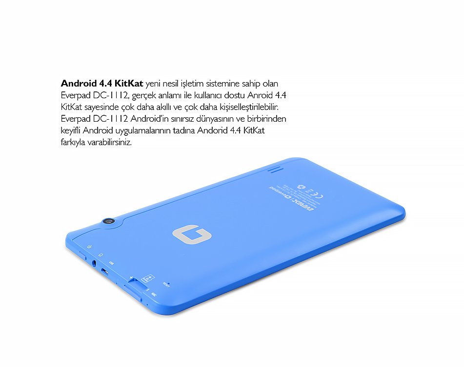 Everest EVERPAD DC-1112 Çift Kameralı 3G Wi-Fi ve Bluetooth Özellikli Usb Girişli 7" HD Panel 512 DDR3 1.3GHz Quad Core 4 Çekirdek 8GB Android 4.4 Kitkat Micro Sd Destekli Ekran Koruyucu Hediyeli Mavi Renk Tablet Pc