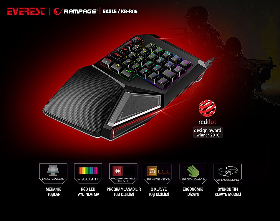 Everest Rampage KB-R05 EAGLE RGB Versiyon USB Aydınlatmalı Gaming Q Multimedia Mekanik Klavye ; Bu mekanik T9 klavye tasarım şıklığı sayesinde 2016 Reddot dizayn ödülü almıştır.
