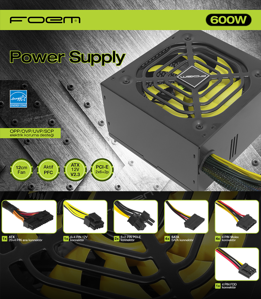 FOEM FPS-G60F12B 600W Power Supply (Aktif PFC, 12cm Fan)
