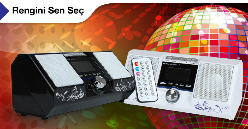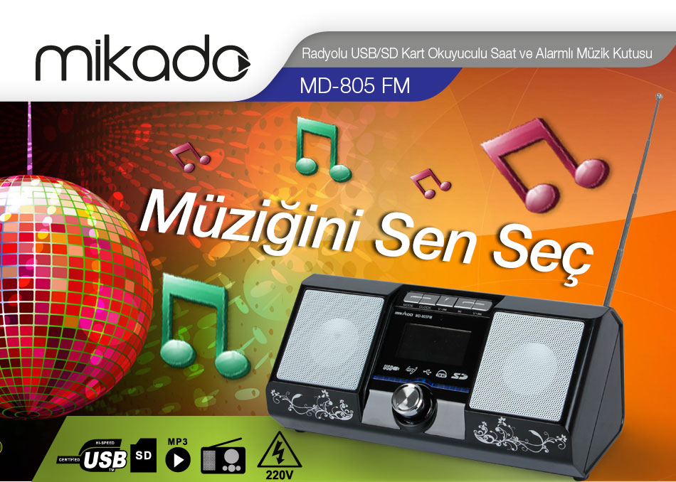 | MIKADO MD-805 FM; ile kendinizi müziğin ritmine bırakın. Kaliteli ses çıkışına sahip olan, MD-805 FM, ruhun gıdası olan müzikten en iyi şekilde faydalanmanızı sağlar. SD Kart ve USB girişlerini kullanarak müzik arşivinizdeki en seçkin parçaları istediğiniz zaman, istediğiniz kadar dinleyebileceksiniz. MIKADO MD-805 FM ile harekete dahil ol. |