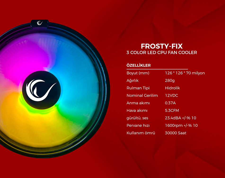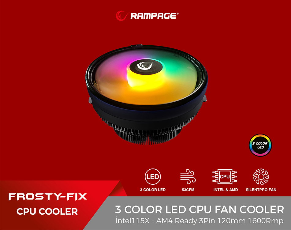 Rampage FROSTY-FIX Intel115X - AM4 Ready 3Pin 120mm 1600Rmp Fixed Renk 3 Renk Led Soğutucu Fan ; Özenle dizayn edilmiş olan bu 3 Renk ledli işlemci soğutucu sayesinde kasanız içerisinde hem mükemmel bir görüntü hemde işlemciniz için sağlıklı bir soğutma sağlamanıza imkan tanır. 120mm boyunda sesiz ve 1600rpm hızında mükemmel bir işlemci soğutucusudur.